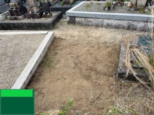 こちらが工事前の写真です。今回は写真の防草シートが敷いてある区画部分に、外柵(お墓の外回りの枠石)から施工をしました。